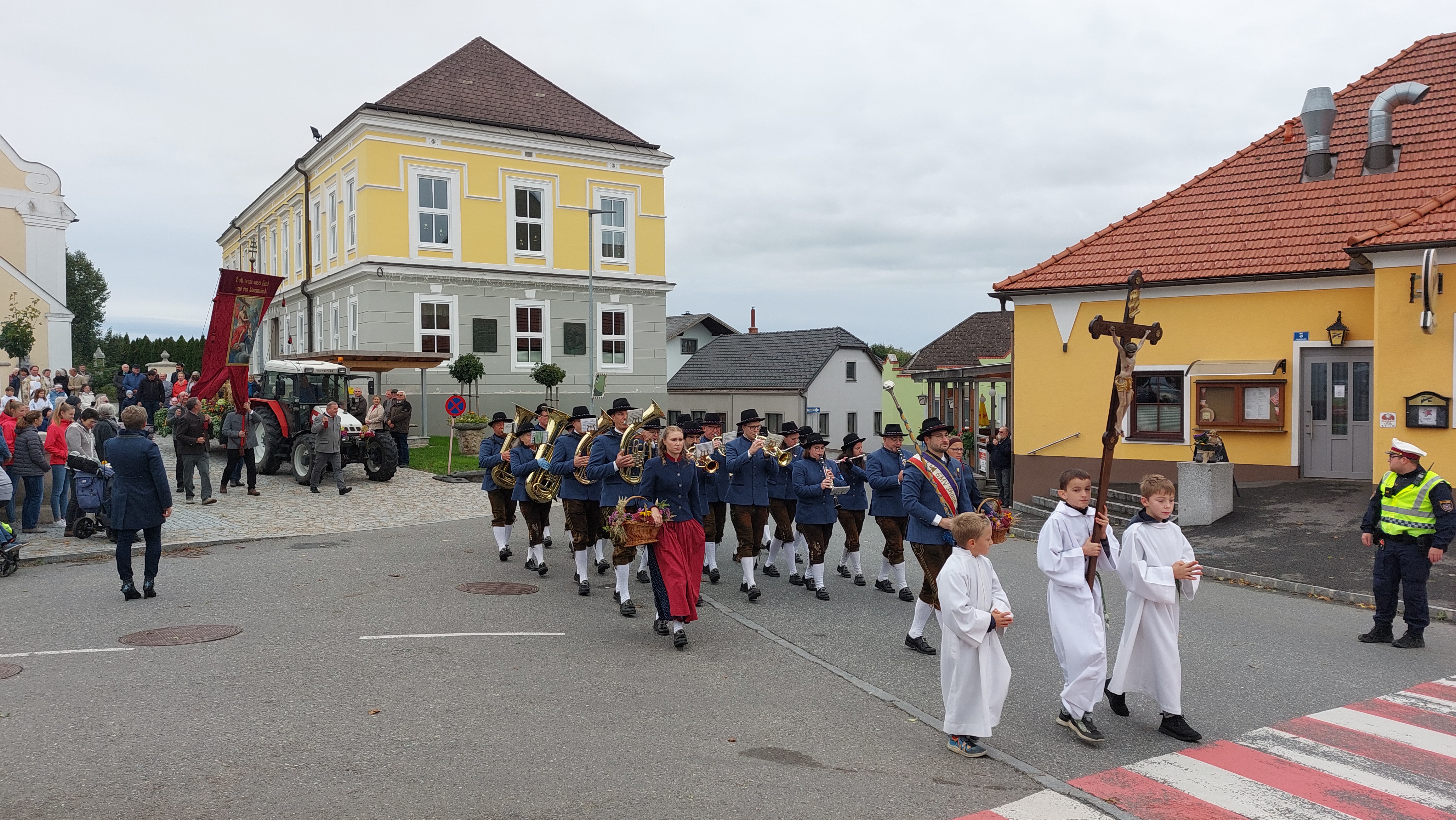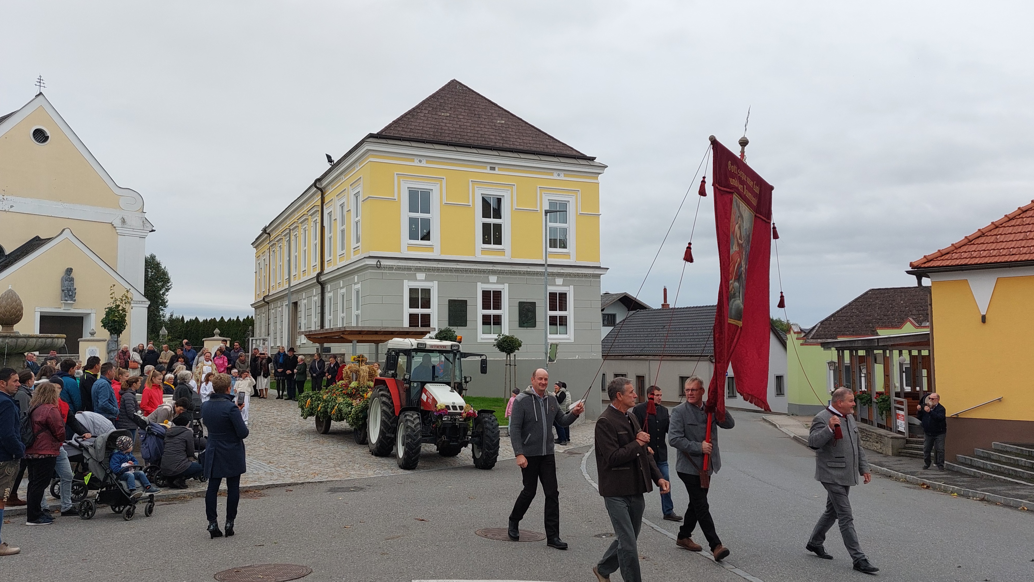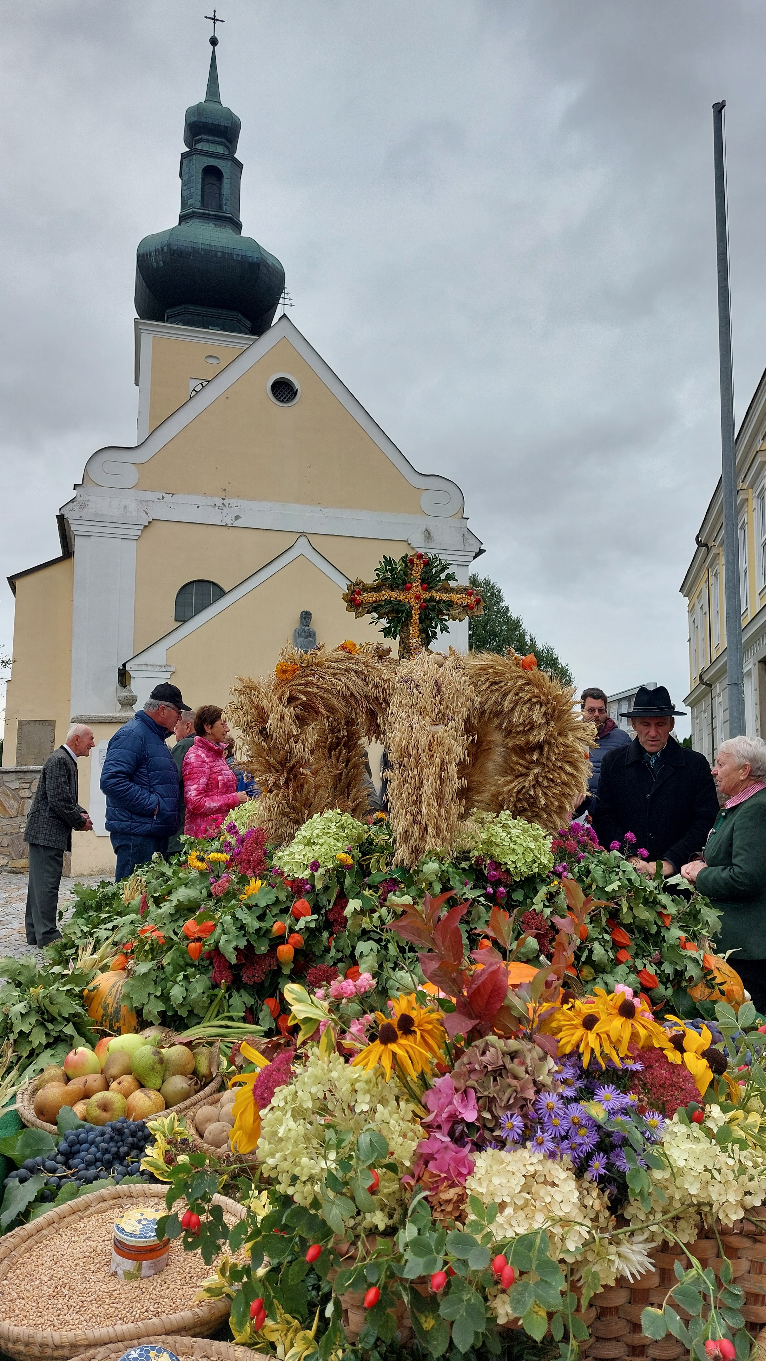 Unter großer Beteiligung der Bevölkerung wurde am 5. Oktober das Erntedankfest gefeiert. Traditionellerweise wurde am Kirchenplatz der Erntewagen und die Erntekrone von Pfarrer Thomas Skrianz gesegnet. Die Ortsgemeinschaft Schirnes war in diesem Jahr dran und stellte einen wunderschön geschmückten Wagen und die Erntekrone zur Verfügung. Danach gings ins Gemeindezentrum zur Hl. Messe, die von der Blasmusik Thaya musikalisch umrahmt wurde. Ebenso der Frühschoppen samt Mittagstisch, wozu die Pfarre einlud. Es war ein sehr schöner Tag, geprägt vom Dank an den Herrgott für die gute Ernte und alle Segnungen unseres Lebens.