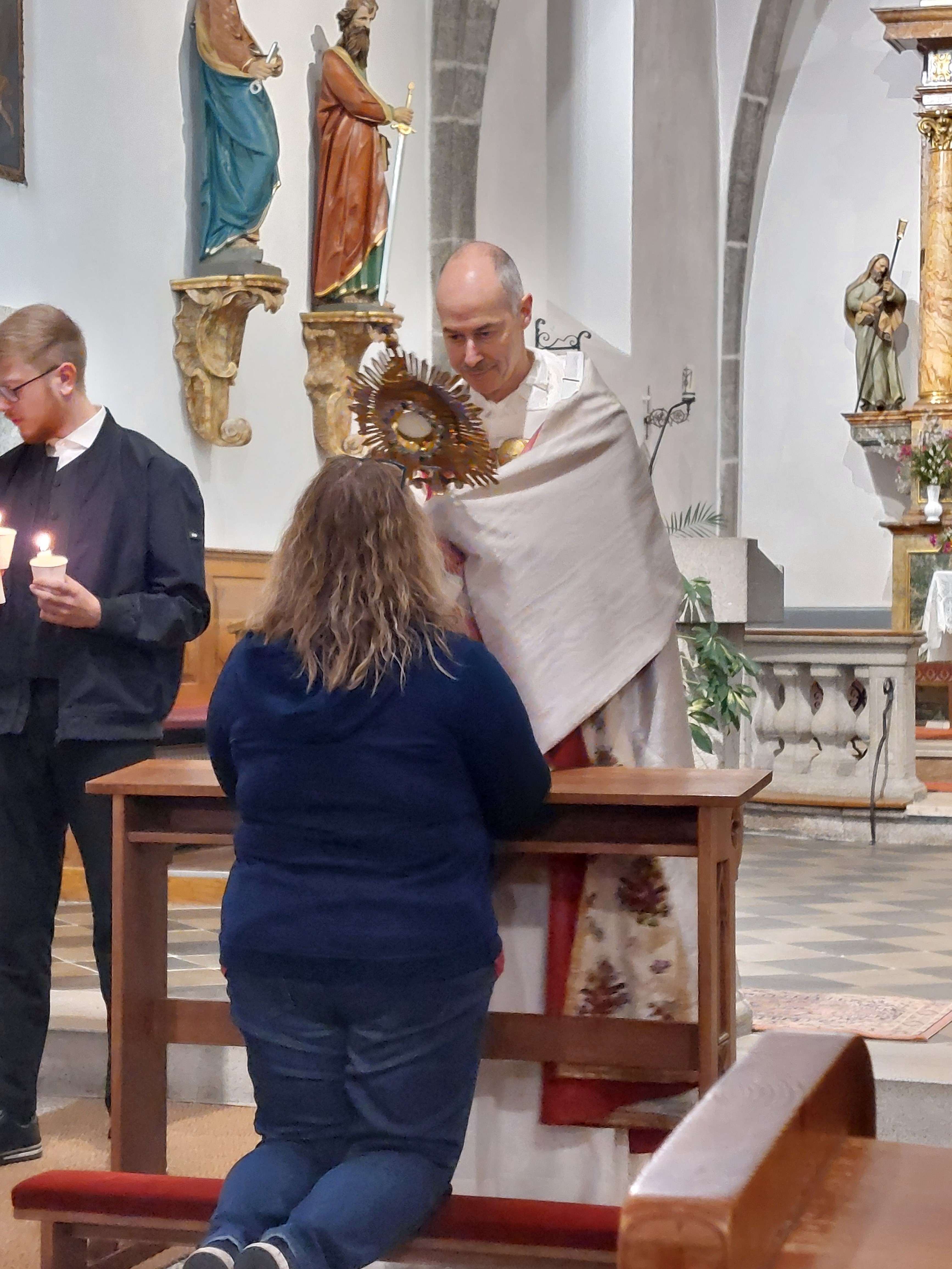 Zum abschließenden Segen zeigte auch der Herr Pfarrer einen persönlichen Schatz, eine mitgebrachte Reliquie des unlängst seliggesprochenen Carlo Acutis aus einer seiner Assisi-Reisen.