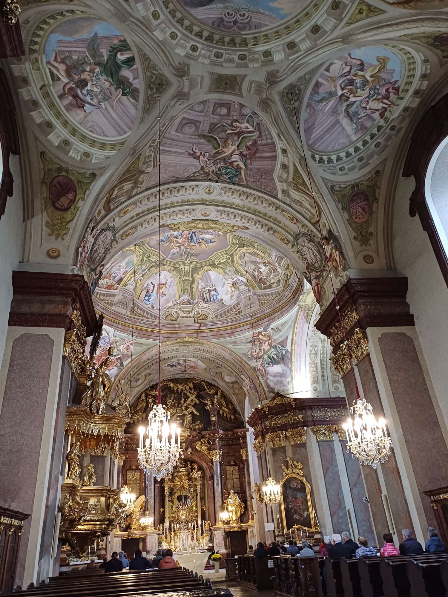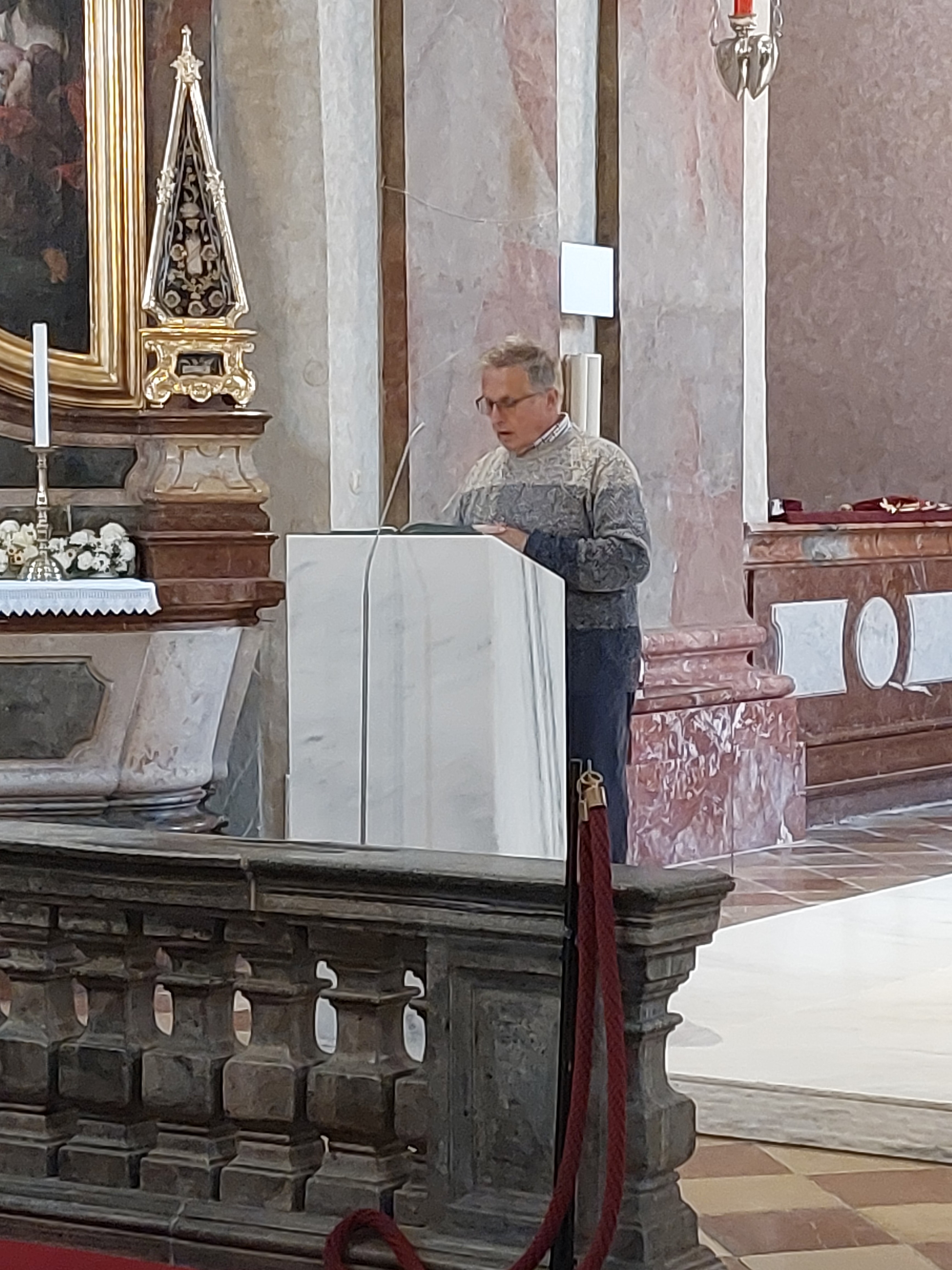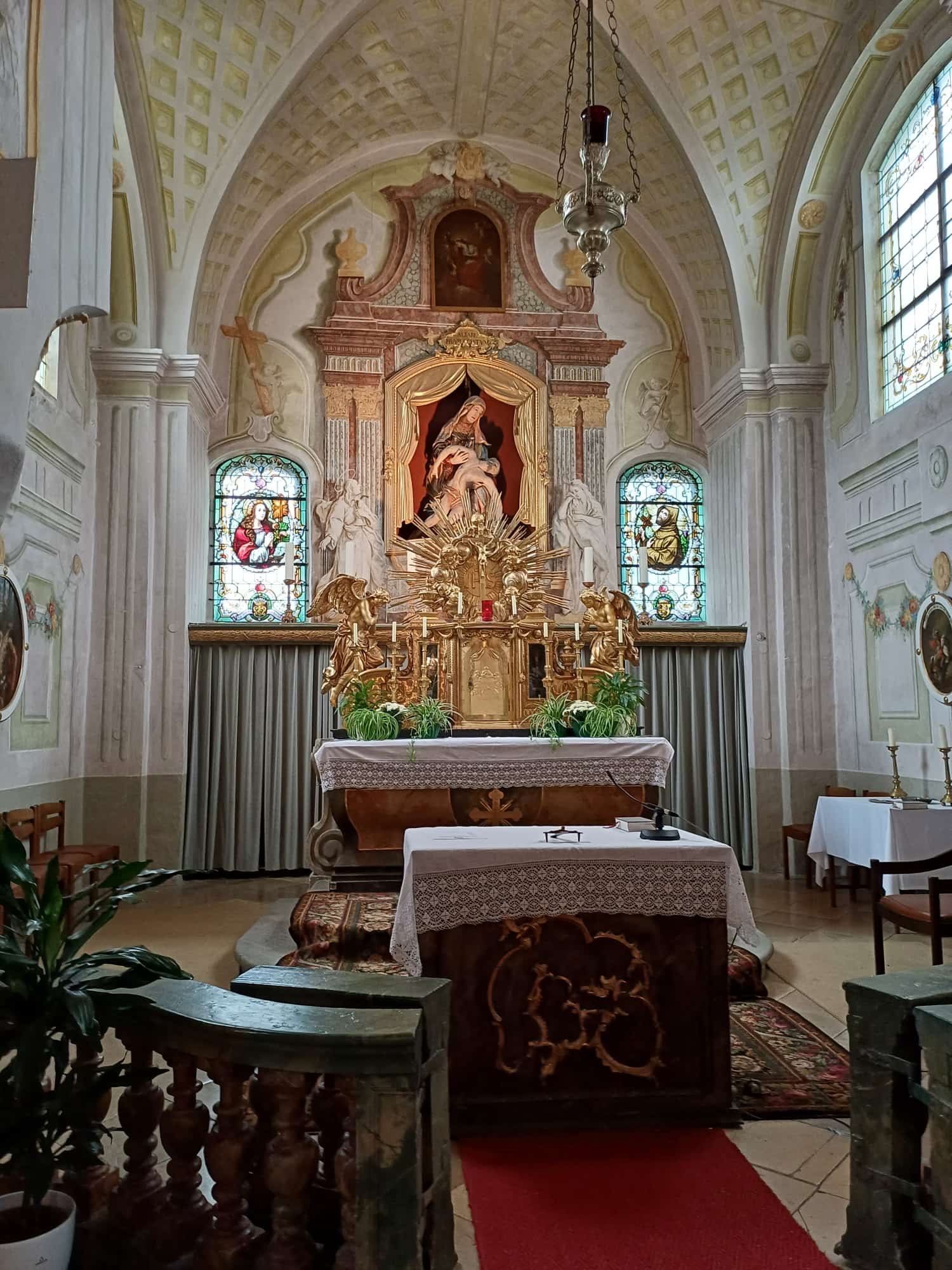 In dieser Kirche haben wir den Segen mit dem „gnadenreichen Loretokindl“ empfangen. Das Loretokindl ist eine kleine Elfenbeinstatue aus den 17. Jahrhundert. Sie soll schon mehrfach gebrochen worden sein und ist jedes Mal von selbst wieder Heil geworden. Daher erbeten sich auch die Pilger Heil durch den Segen mit dieser Statue. Anschließend durften wir in dieser wunderschönen Klosterkirche mit unserem Pfarrer Thomas und drei Ministranten den Wallfahrergottesdienst feiern.