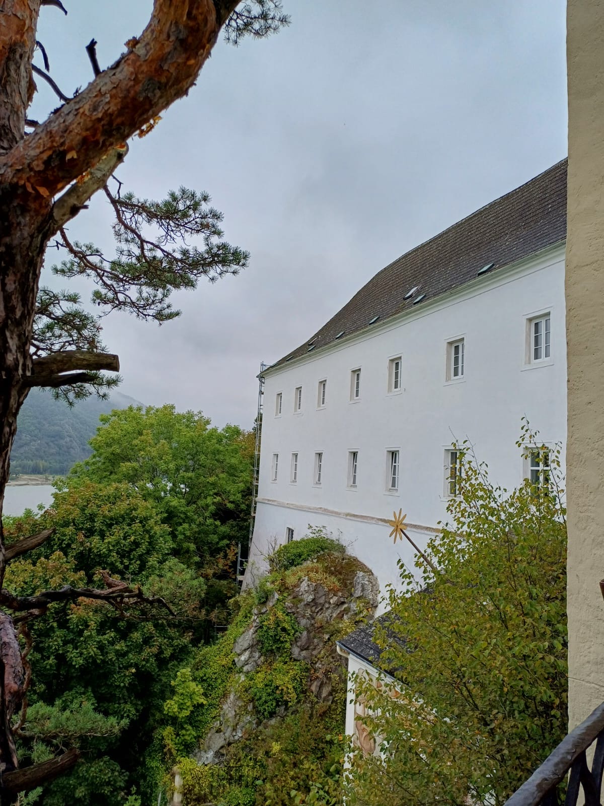 Das Kloster Schönbühel direkt am Donauufer war unser nächstes Ziel. Landschaftlich wunderschön gelegen mit Blick auf Stift Melk, innen gut restauriert und behütet, ist diese ehemalige Serviten-Klosterkirche ein schmuckes Kleinod unserer Heimat Österreich. Als einzige Glaubensstätte Österreichs beherbergt sie die drei wichtigsten Lebensstationen unseres Heilands - "Bethlehem", "Golgotha" und "Auferstehungskirche".