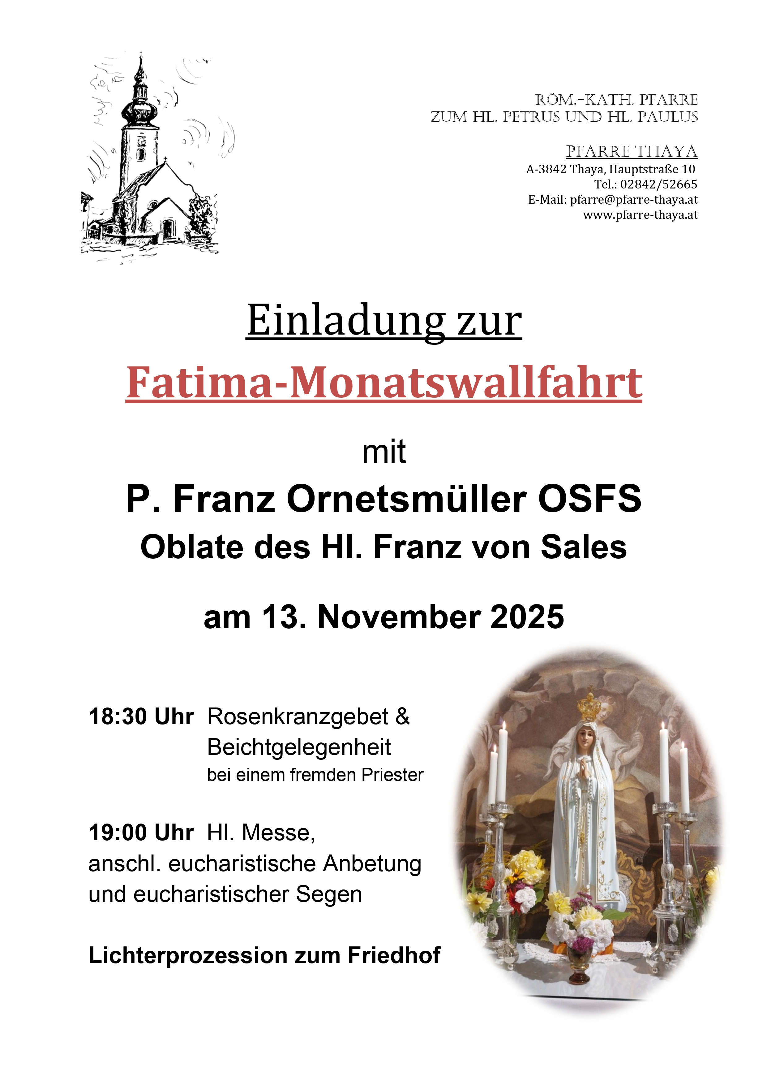Was ist eine Fatimafeier?Am 13. Oktober 1917 bei der fünften und letzten Erscheinung der Gottesmutter in Fátima (Portugal) geschah das von der Jungfrau Maria angekündigte Sonnenwunder. Ein Augenzeuge beschreibt es folgendermaßen: „So wie ein Blitz aus heiterem Himmel wurden die Wolken beiseite gerissen und die Sonne erschien am Zenit in all ihrer ganzen Pracht. Sie begann auf ihrer Achse wirbelnd zu rotieren, wie beim großartigsten Feuerrad, das man sich vorstellen könnte, alle Farben des Regenbogens annehmend und mehrfarbige Lichtblitze aussendend, den verblüffendsten Effekt produzierend. Dieses sublime und unvergleichbare Schauspiel, das drei verschiedene Male wiederholt wurde, dauerte ungefähr zehn Minuten. Die ungeheure Menge, überwältigt durch den Beweis von solch einem gewaltigen Wunder, warf sich auf ihre Knie.“ In Fatima wird die die Statue der Mutter Gottes in einer beeindruckenden Lichterprozession über den großen Platz getragen. Wir in Thaya tragen nach dem Wallfahrtsgottesdienst unsere Marienstatue, die Thayinger Madonna, einmal jährlich an einem 13. – einem Erscheinungstag – mit Gebet und Gesang durch den Ort und machen bei der ehemaligen Bürgerspitalskapelle – wo diese Statue über zwei Jahrhunderte lang stand – eine Gebetsrast. Der Erscheinungen von Fatima gedenken wir bei jeder Fatimafeier am 13. eines jeden Monats und bitten weiterhin um ihre Fürsprache. |