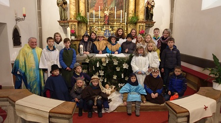 Pfarrer Auhser feiert am 24. Dezember mit zahlreichen Gottesdienstbesuchern die Kinderweihnachtsmette in der Pfarrkirche Thaya. Dabei wird das Weihnachtsevangelium ‚musicalisch‘ von Manuela Müllner gestaltet.